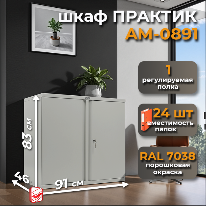 Шкаф АМ 0891 сочетает в себе прочность, вместительность и современный стиль, создавая порядок в вашем рабочем пространстве.