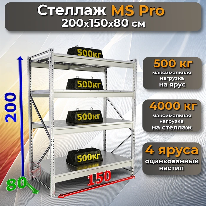 Стеллаж в гараж металлический MS Pro 200х150х80 4 полки